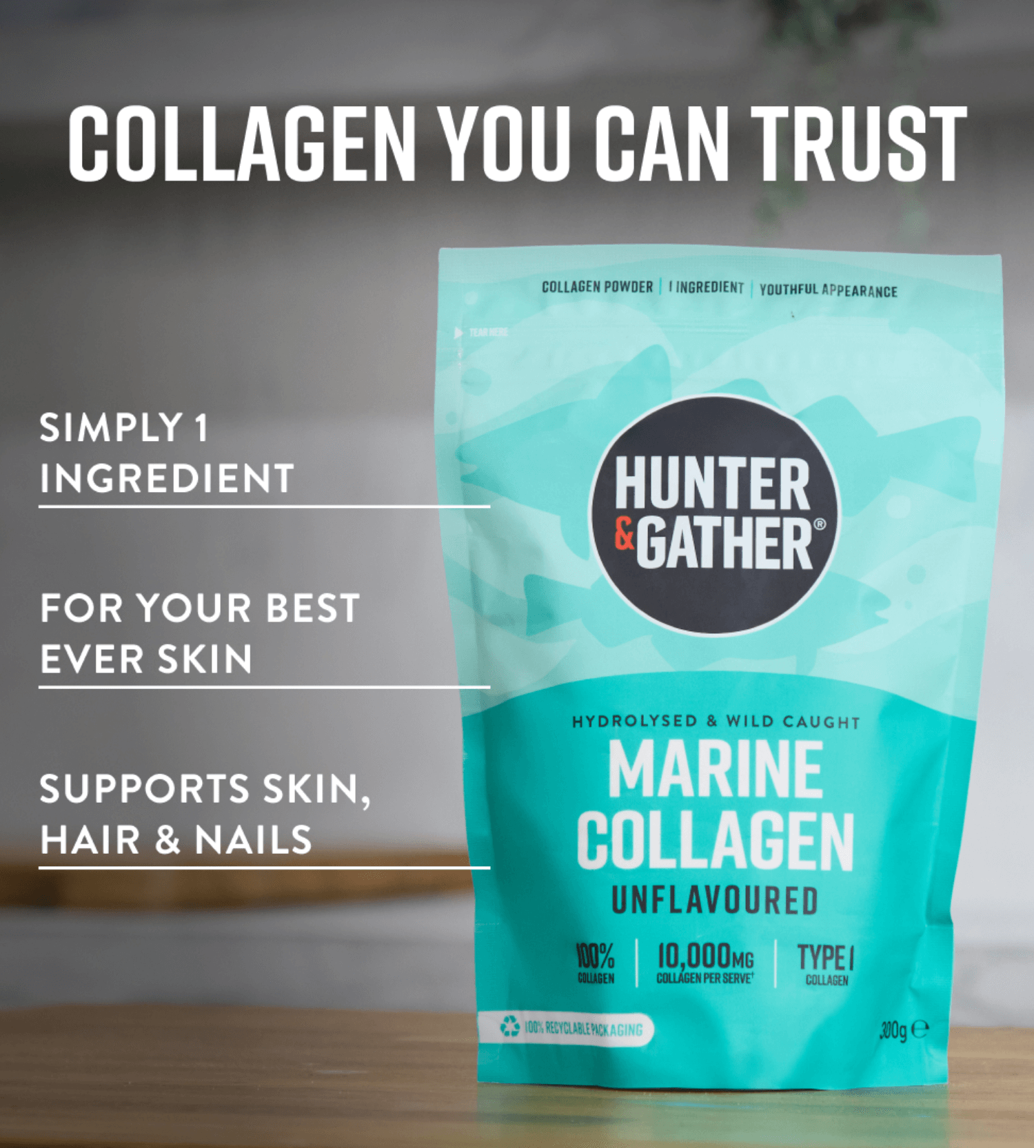 Hunter & Gather Wild-Caught Marine Collagen Peptides, also known simply as Marine Collagen Powder, is from Wild-Caught North Atlantic White Fish. It is produced using an innovative enzymatic process without the use of solvents, GMO's or other contaminants, ensuring you benefit from all 18 amino acids* that collagen peptides provide.